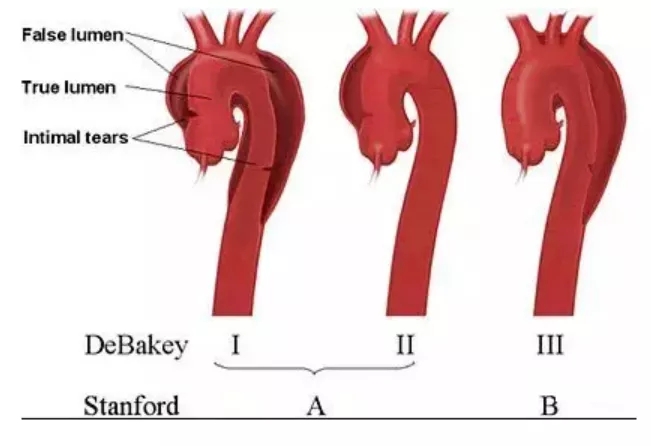 Stanford-A:第一破口位于升主动脉、主动脉弓或近段降主动脉。夹层累及升主动脉,以及主动脉弓、降主动脉和腹主动脉。