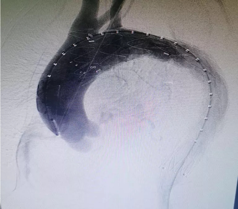 徐阿姨血压、脉搏、心率等各项生命监测指标控制良好,病情趋于稳定。罗湖医院血管外科主任黄智勇主任带领团队为徐阿姨行胸主动脉造影+胸主动脉覆膜支架腔内隔绝术+左锁骨下动脉烟囱支架置入+右髂动脉取栓术。