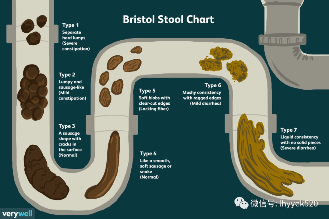 便秘粪块形状多属于上图Bristol 分级中 1 级(分散的硬块, 似坚果)、2 级(腊肠状, 成块)、3 级(腊肠状, 表面有裂缝)形状。