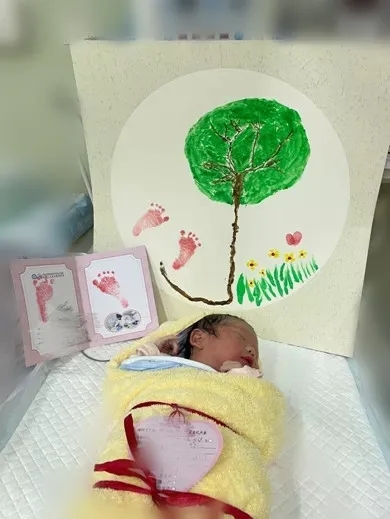 这幅胎盘画由助产士与产妇及家属共同完成,也叫“生命之树”,寓意着生命像树一样的旺盛生长发育,也希望宝宝能健康快乐的成长。