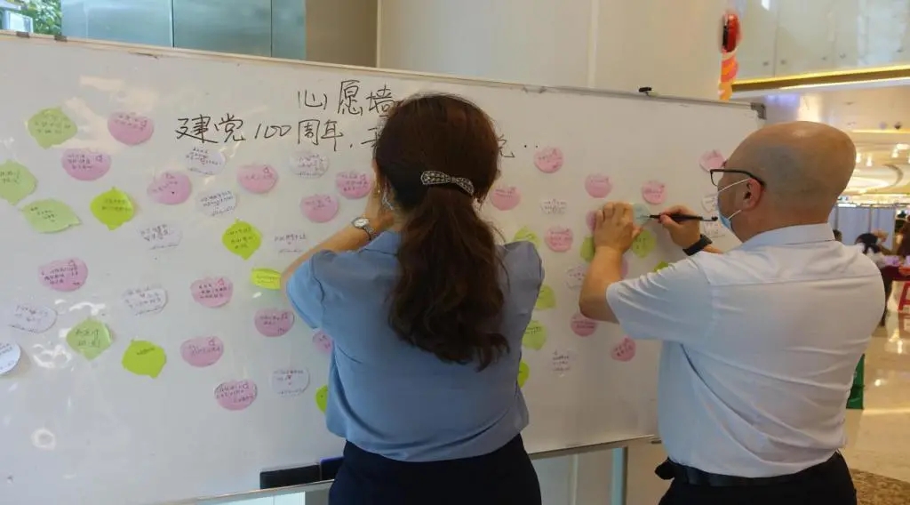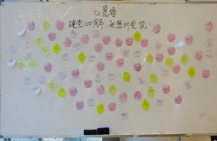在义诊活动现场,一块写着 " 心愿墙 " 的大白板吸引了路过人群的目光,大家纷纷为它驻足。这些人中,他们有的是患有眼疾的阿姨、有的是放学路过的学生、有的是附近单位的保安人员、有的是商场的工作人员、有的是附近的居民 …… 他们主动拿起笔,在心愿卡上一字一句地写下对党的祝福,并亲手贴上,表达对党、对祖国的热爱之情。数十分钟后," 心愿墙 " 贴满了对党祝福的心愿卡。