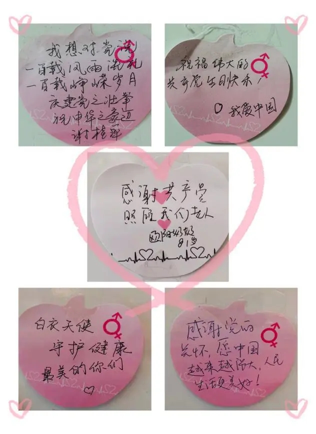 " 我眼睛不好,看不到字,听说这里可以写对党的祝福语,我就请护士帮我写。" 患有眼疾的欧阳阿姨真切地说道 " 感谢中国共产党对我们老人的照顾,祝党生日快乐!"